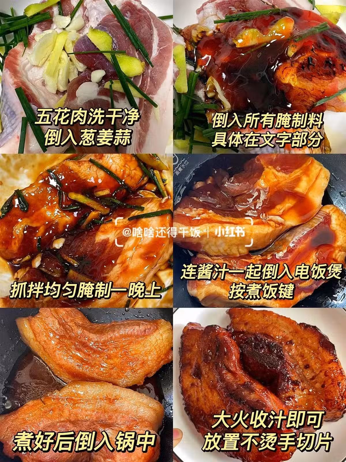 第二天連醬汁一起倒入電飯煲中(電飯煲記得刷點油)按煮飯鍵,煮好的五花肉倒入平底鍋大火收汁即可!!