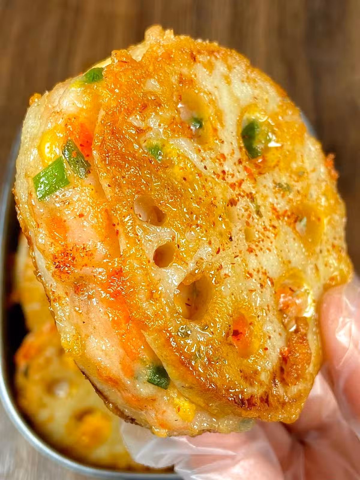 外面焦香焦香的,裡面的蝦滑咬開還會爆汁勒!!外面裹的蛋液煎出來金黃金黃的真的很絕!!出鍋可以撒些辣椒粉,椒鹽粉吃哦!!