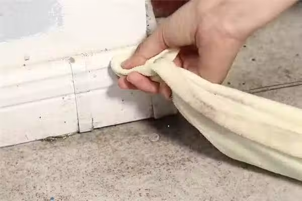 勒緊後再用它清潔墻角,硬幣是比較薄的,對於清理一些縫隙的地方非常的方便,而且清理起來也很徹底。擦完之後灰塵全部粘在毛巾上面了,清潔完之後我們就可以發現,這種縫隙變得特別的干凈。