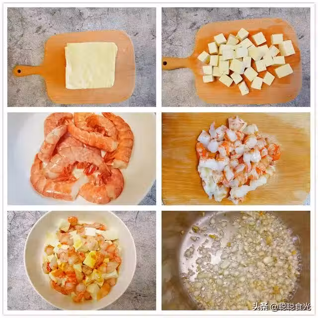 1、大豆腐切成小塊,新鮮的大蝦,去掉蝦頭,剝出蝦仁,在蝦仁中加入適量鹽抓勻。
