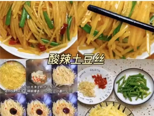 土豆絲洗凈澱粉瀝干水分,油熱加入蒜末干