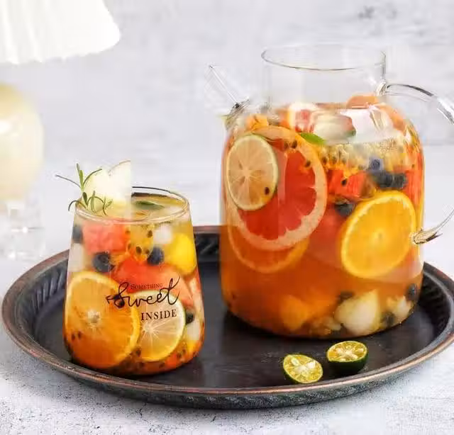 杯中加入百香果十蜂蜜拌勻十擠入青桔汁,依次放入水果,倒入梨山烏龍冷泡茶。