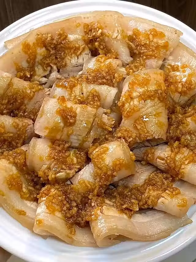 4.肉切薄片,淋上蒜醬就可以吃了。