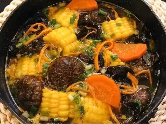 (2)起鍋燒油,起溫後加入胡蘿蔔翻炒至軟,黑木耳翻炒至軟,再加入清水煮沸,加上玉米、香菇、蟲草煮開3分鐘。