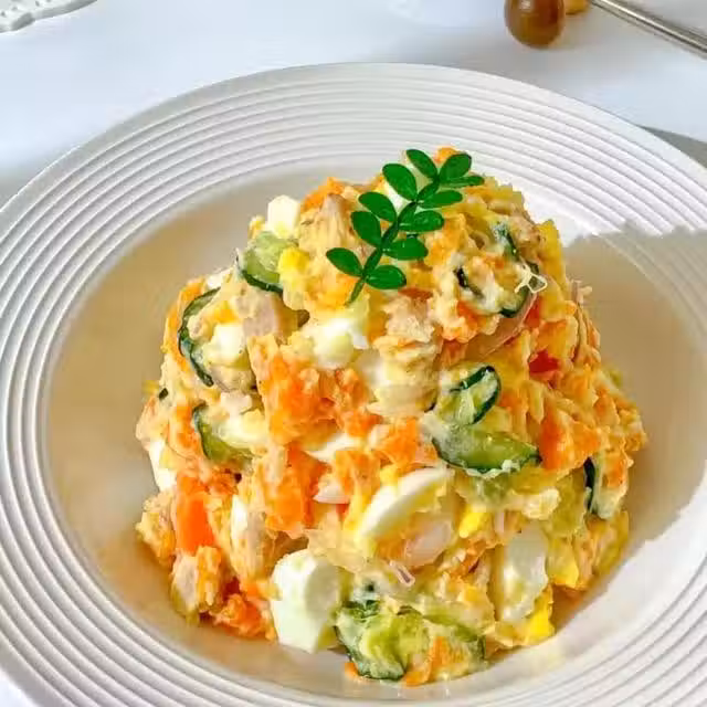 土豆x1、胡蘿蔔半根、雞蛋x2、午餐肉適量蟹柳x1、黃瓜半根、洋蔥適量、喜歡的都無糖酸奶2勺、低卡蛋黃醬適量、黑胡椒鹽