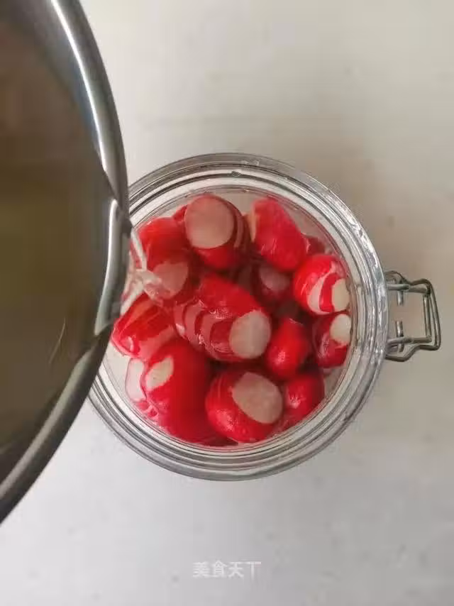 5、腌好的蘿蔔放入乾淨的玻璃瓶中,加入晾涼的酸甜水,放入冰箱冷藏12小時以上即可食用,要儘快吃完哦!