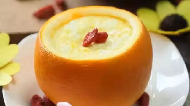 2、橙子皮中打入雞蛋,再放入攪碎的果肉和適量的冰糖,然後放入蒸鍋蒸10分鐘左右;