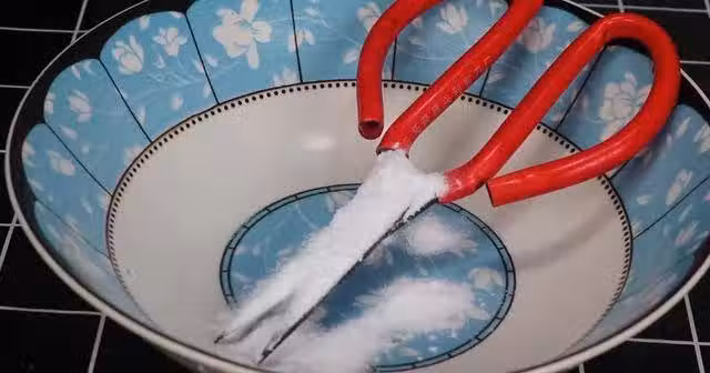 接著咱們再向碗中倒入適量的白醋,而白醋具有非常強的軟化能力,白醋和小蘇打放在一起可以產生化學反應,能夠快速去除剪刀上面的鐵鏽。