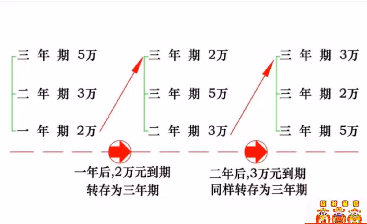 存了三年期的定期存款,將其中的三萬存成兩年期的定期存款,將其中的一萬存了一年期的定存款。