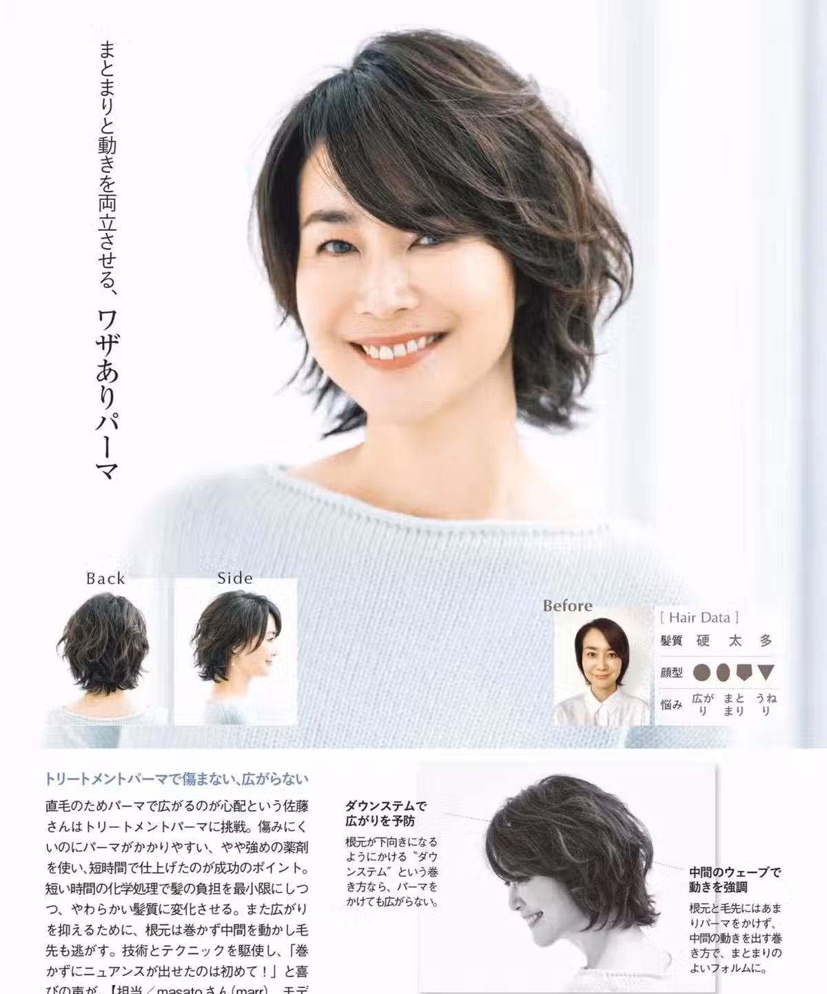 類似於泡麵卷的小卷造型通常會比較死板,很容易讓整個人看起來老氣橫秋。想要擁有減齡時尚感,建議從大卷髮開始嘗試。上圖這款卷髮,頭頂表面採用紋理燙的方式讓其飽滿圓潤起來,臉部周圍採用大卷燙髮,卷翹髮絲在臉周遊走並伴隨著外翻的弧度,將大氣與優美娓娓道來。