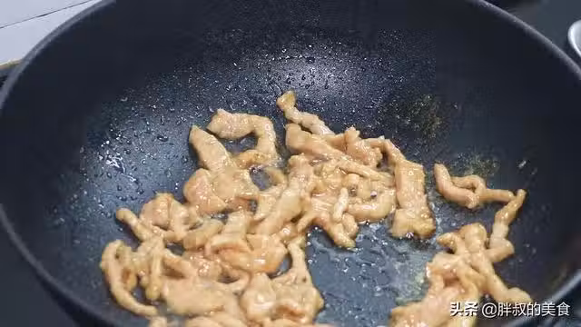 ⑥:重新起鍋燒油,下大蒜和小米椒翻炒出香味然後把焯過水的四季豆和炒過的肉絲倒進來,調味加入生抽,老抽和鹽還有雞精。用大火翻炒均勻,把四季豆炒熟,最後淋入水澱粉勾芡就可以完成出鍋啦。