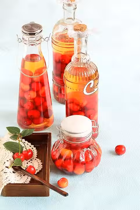 3.將櫻桃放入密封瓶中,約占2/3,將冰糖放入密封瓶中,將瓶填滿,倒入高粱酒,將瓶蓋蓋緊