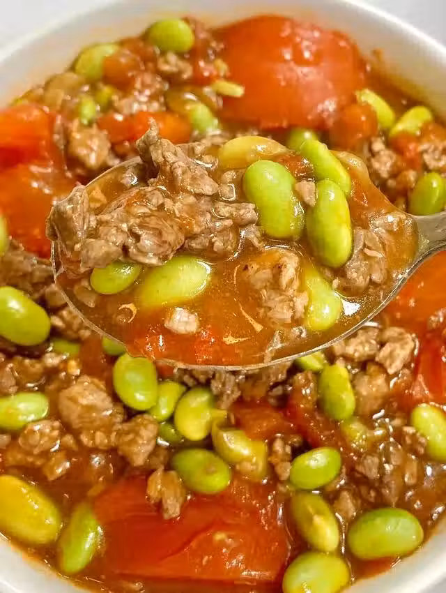1、茄汁毛豆煮牛肉