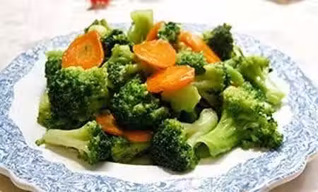 3、鍋中底油,油熱倒入西蘭花和胡蘿蔔,大火翻炒2分鐘,然後加少許鹽,味精,翻炒就可以起鍋了。
