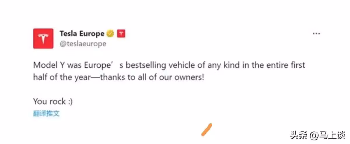 特斯拉官方帳號發布消息:特斯拉 Model Y 是上半年歐洲銷量最高車型。