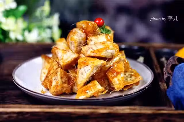 4.關火後,倒入炸過的芋頭塊,迅速地翻勻、盛盤即可。