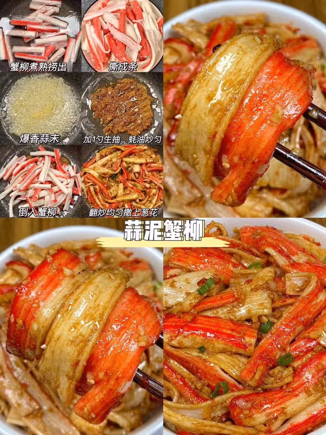 蒜泥蟹柳是一道口感鮮美的冷盤。將蟹柳放入沸水中快速煮熟,取出後立即用冷水沖涼以保持爽脆的口感,切成適口大小的段。蒜頭剝皮,搗成蒜泥,加入生抽、醋、糖、香油等調製成蒜泥汁。將蟹柳與蒜泥汁拌勻,放置片刻讓蟹柳充分吸收蒜泥汁的味道。冷藏後食用,味道更佳。
