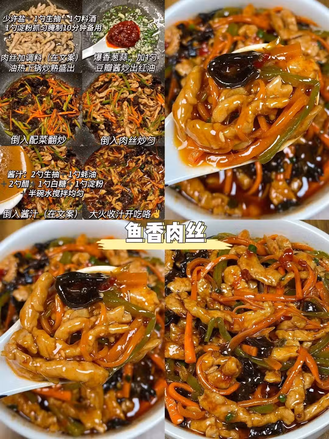 緊接著將腌制好的肉絲快速下鍋炒至變色,迅速盛出備用。將事先準備好的蔬菜配菜(如胡蘿蔔絲、木耳絲、青椒絲等)下鍋翻炒至斷生,再次將肉絲倒入一起快速翻炒。最後,將之前調製好的魚香醬汁均勻倒入鍋中,大火快速翻炒,讓肉絲和配菜都均勻裹上醬汁。