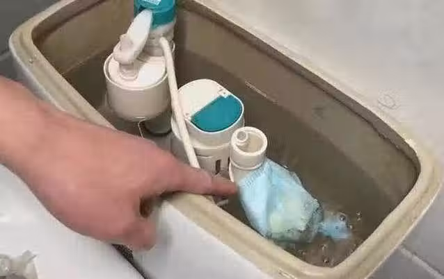 將口罩剪開一個口子,塞入香皂綁好,然後放進馬桶水箱裡面,這樣每次沖水都會有香皂水流出,這樣也會消除一些異味。
