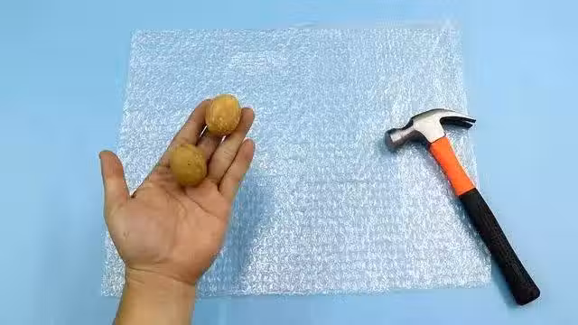 平時家裡會吃一些堅果,如果我們直接用錘子砸堅果,那堅果的殼有可能飛得到處都是很難打掃,我們也可以用這樣的氣泡墊包裹著堅果,然後再用錘子敲打,這樣就 可以防止堅果殼飛得到處都是了。