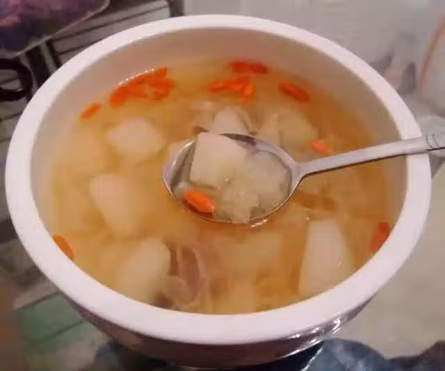 2.鍋里加入切塊的梨,和其他所有食材,加足量水,估計40分鐘後煮成三碗的量,大火煮沸後,小火40分鐘,即可出鍋。
