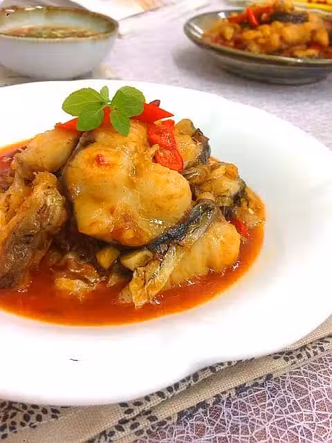 5.鍋里留油,倒入薑末蒜末,蔥白,紅椒末爆香,淋入少許料酒,倒入適量清水,加入適量菁選醬油,老抽,鹽,味精,放入魚塊,再加入適量白糖,豆瓣醬,攪拌勻,加入少許水澱粉,把鍋中食材炒至入味兒即可。