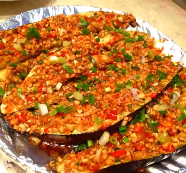 4.烤箱200度預熱5分鐘後,把茄子放入烤盤。入烤箱中層上下火大約烤制25分鐘左右。烤好後取出撒上香蔥末即可。