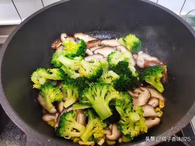7、同時加入生抽,蚝油,鹽,翻炒均勻,淋入水澱粉,翻炒均勻就可以出鍋啦!好吃又簡單的西蘭花炒香菇就做好了。