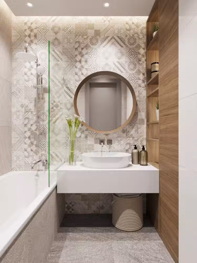 ▲這是一款在小衛生間中,玻璃隔斷用於浴缸與洗手台之間的一個效果,通透性強,然後又能達到想要的需求。當然在顏值上,也是花了一番心思的,除了最能提升美感的牆壁花磚之外,洗手台、圓鏡簡潔大方,質感十足,旁邊的收納設計,更是實用了。