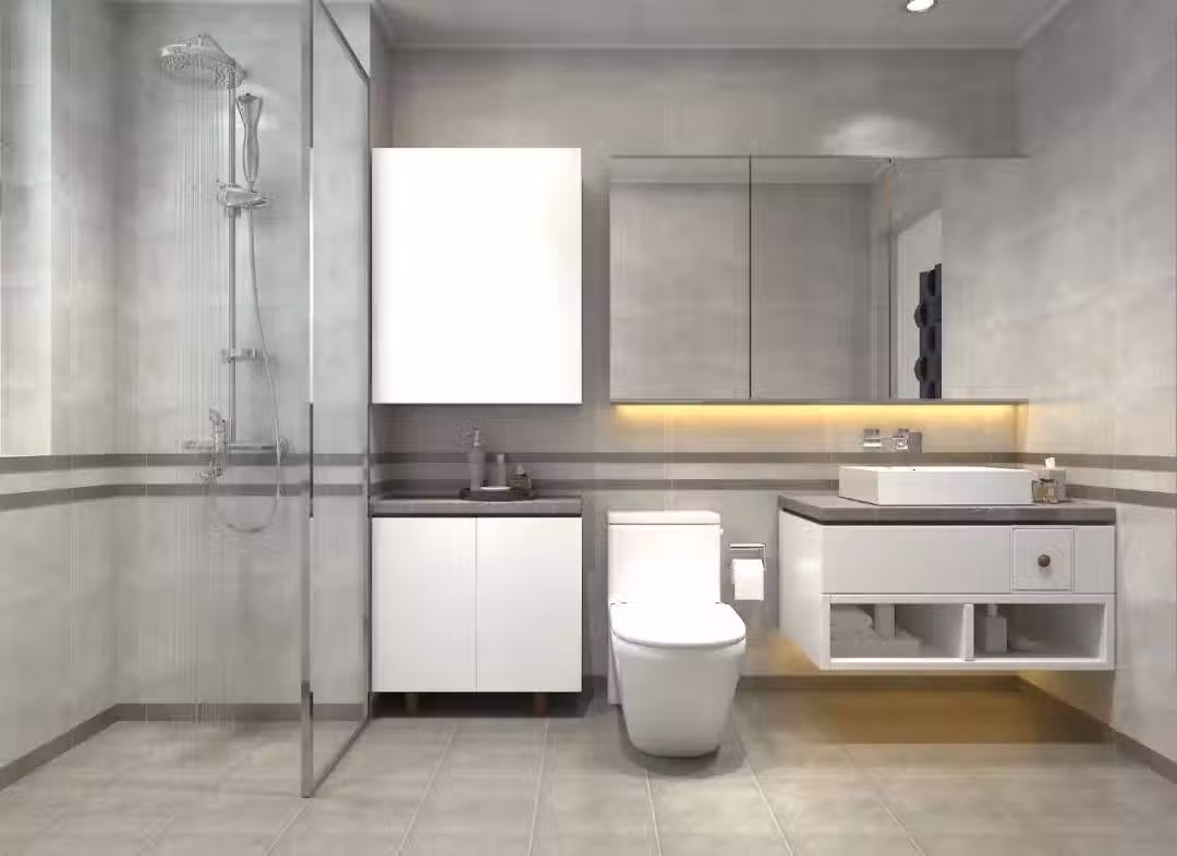 ▲這一款衛生間空間較大,兼具了多種當前比較流行的設計,如洗手台懸空,鏡子櫃一直延伸到馬桶上方,不浪費一點牆壁空間,底部還裝了燈管,使用方便也漂亮。馬桶旁邊還裝了收納櫃,極大解決衛生間收納難題。玻璃隔斷乾濕分離,還通透明亮,真不錯。