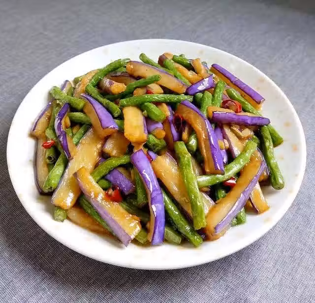5、放入茄子炒至稍軟,入豆角,澆入味汁,後入清水少許,翻勻炒開,蓋上蓋,小火燜至汁濃即可。