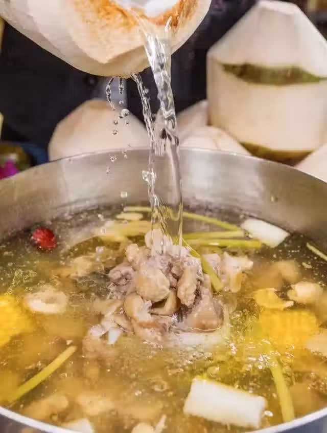 2、土雞汆水後撈出,用清水洗凈瀝干水份備用。椰子在側面輕輕地開個口,把椰子水倒出來,然後把椰子切好準備煲湯。