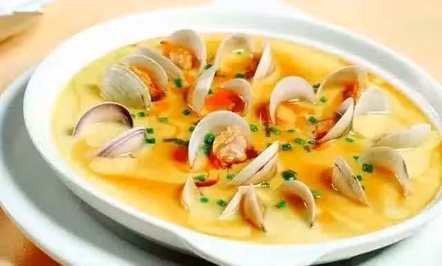 1、姜蔥加水煮開,放入洗乾淨的白蛤,煮至微開備用。