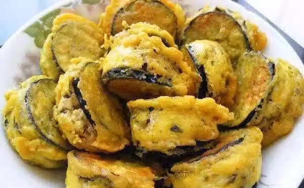 7、油四成熱時茄盒沾麵糊放入油鍋中,中小火炸至兩面金黃即可。