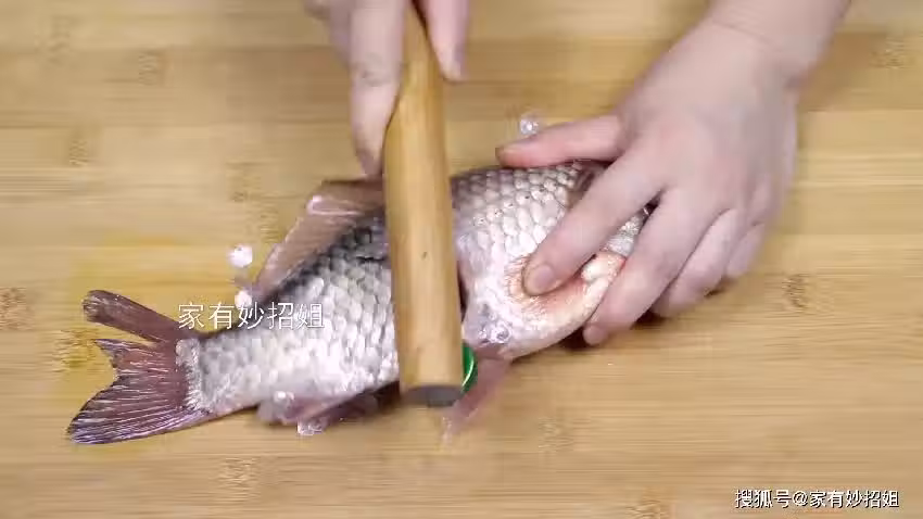 接著,我們再將魚放在案板上,然後一手按住魚身,把魚固定住,另一隻手抓住擀麵杖沒有固定啤酒瓶蓋的一端,把另一端的瓶蓋從魚尾處往上刮。
