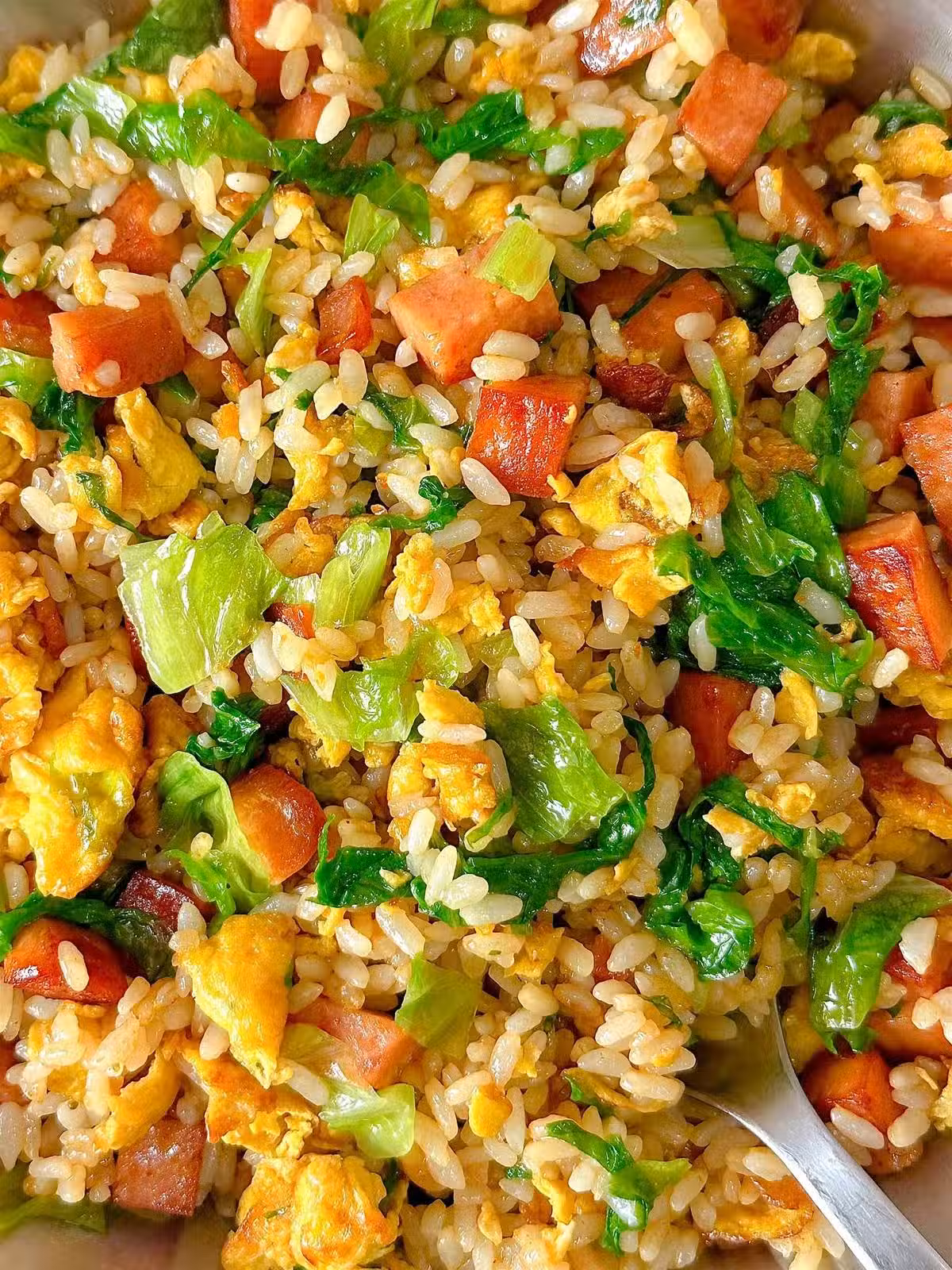2、熱鍋燒油,下入午餐肉煎至兩面金黃,然後倒入炒好的雞蛋,加入一勺生抽,一勺蠔油,倒入適量的剩米飯翻炒均勻。