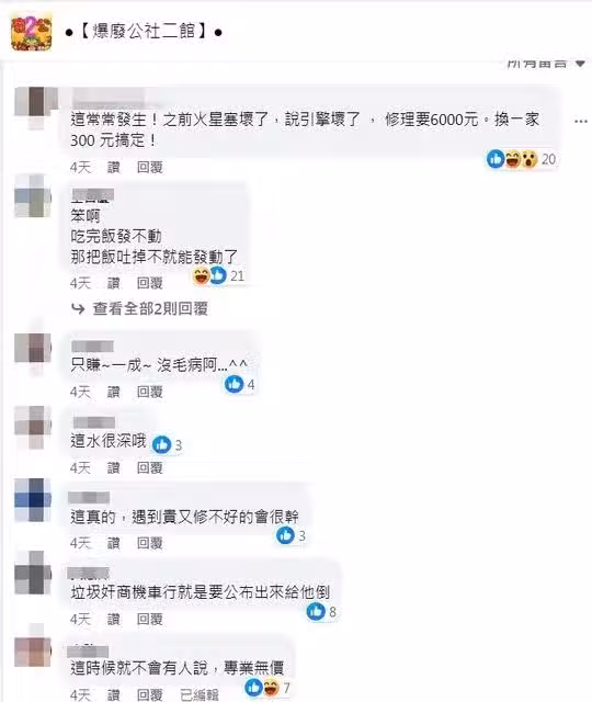 其他網友則分享:「之前火星塞壞了,說引擎壞了,修理要6千,換一家3百搞定!」、「騎我爸的老車顧路,剛好旁邊有機車行說要幾千到萬,之後我爸牽去認識的機車行,換顆火星塞1百解決。」、「沒檢查就說:『啊!你這個縮缸了要彈缸啦!』後來牽去另一家換火星塞就好了。」