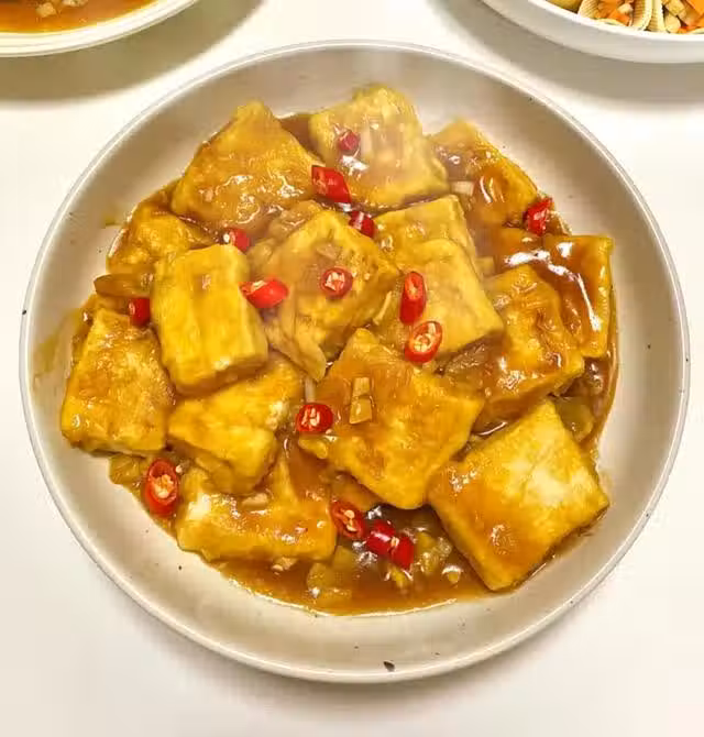 2爆香蒜末小米辣,翻入豆腐塊翻炒,倒入料汁,大火收汁
