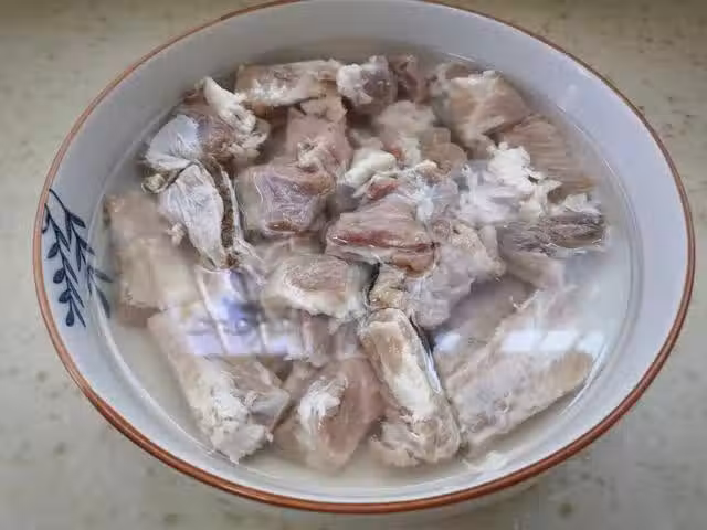2、浸泡後的排骨多衝洗幾遍後,撈出擠干水分放到盆中,接著來腌制一下排骨,加入少許的胡椒粉,1勺生抽,一勺料酒,適量食鹽,抓拌均勻,腌制20分鐘入味。