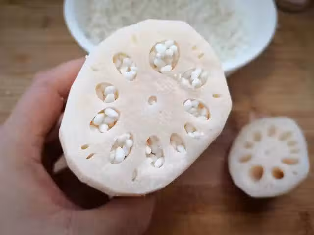 4、把蓮藕蓋子蓋上去,用牙籤固定好,避免糯米流出,插牙籤的時候要斜著插,讓蓮藕成為一個完整的藕節。。。