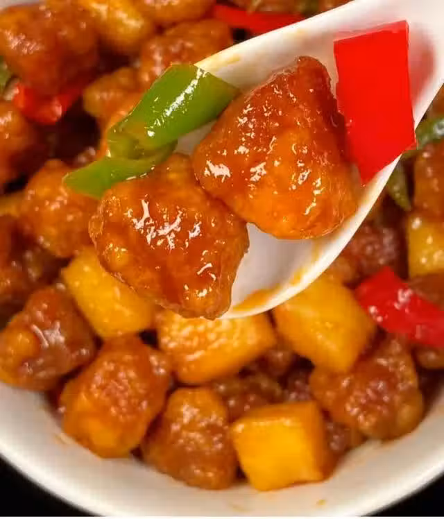 4倒入菠蘿,炸好的裡脊,辣椒,翻炒均勻即可。