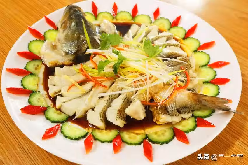 5.把鱸魚蒸好以後關火,揀出蔥姜,控去湯汁,再把鱸魚放入另一個盤中,先擺上一圈黃瓜片,再擺上紅椒片點綴,最後放上蔥薑絲,澆上蒸魚豉油,再澆上一勺200度的熱油,激發出蔥姜的香味,美味即成。