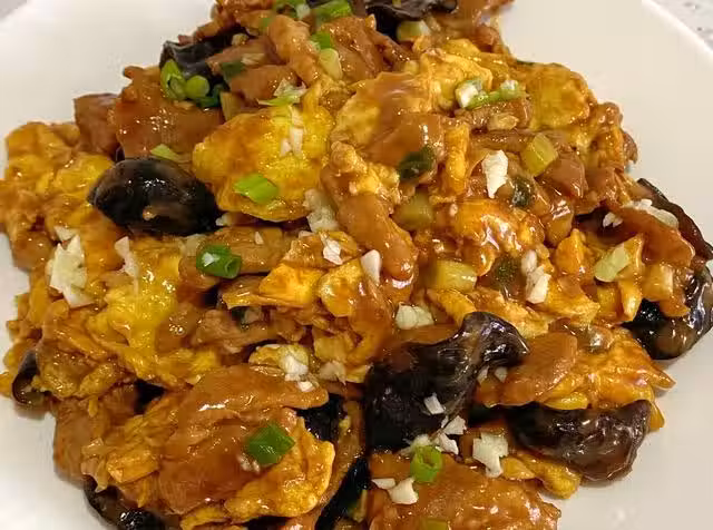 3、鍋中放油燒熱雞蛋炒熟後盛出,放入肉片滑炒,肉片定型後放入木耳翻炒一會,淋上料汁翻炒,最後放入雞蛋撒上蔥花蒜末,淋上點花椒油,翻炒均勻就可以出鍋了。