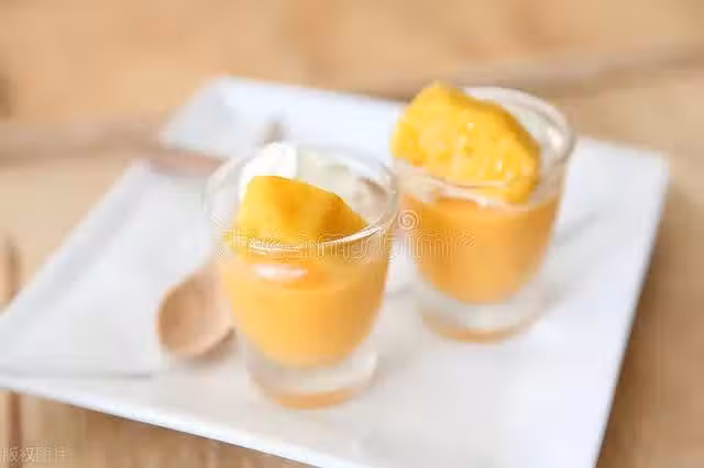 用料:牛奶250g、芒果丁200g、吉利丁片2片(10g)、煉乳40g