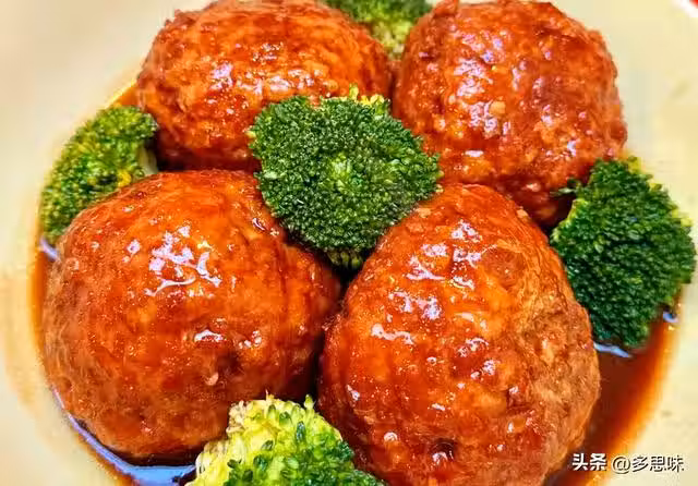 7、煮制:用糖色、生抽、老抽和八角調湯汁,加入丸子,水量沒過丸子,小火煮2小時。收汁:大火燒開,稍微勾芡。裝盤:擺上西蘭花點綴,將湯汁淋在丸子上