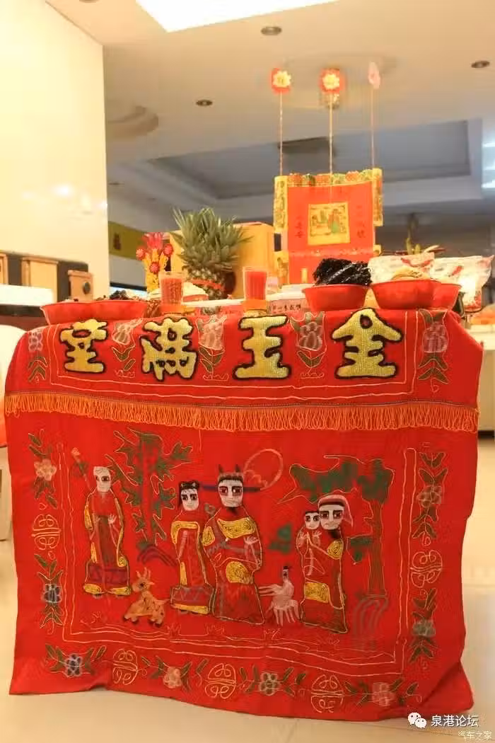 桌面的木紋必須橫對大門,若方桌擺放不下全部的貢品,也可以在方桌後面擺放小圓桌,方桌的正向須掛桌裙,桌裙為艷紅底色的織著吉祥圖案的綢布。