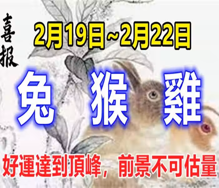 生肖兔的朋友一直是財富和財富的寵兒。 他非常慷慨、真誠、受歡迎、隨和、真誠、溫柔、禮貌、聰明,對朋友特別友善和真誠。 從2月19日到2月22日生肖兔和他們的快樂事件被重複,喜鵲在門前不斷吠叫,桃花盛開。 它會一天比一天好。 財富將繼續,意外之財將接踵而至。 別忘了不管你有多忙,你都必須和你的好朋友們聚在一起,及時維持你的人際關係。 在不久的將來,財富和財富將繼續被槓桿化。 賺很多錢不是問題。 等待美好的生活,生意興隆,桃花盛開。 此外由於早年積累了許多接觸,未來將暢通無阻,未來內外都會有好消息。