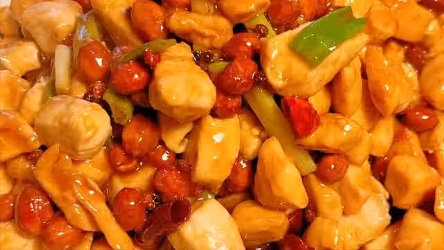 做法:將雞胸肉洗凈,切成小丁備用。青椒、紅椒去籽切成小塊,干辣椒剪成小段,姜切成片,蒜切成末備用。熱鍋涼油,放入雞丁,中小火慢慢煎,煎至兩面金黃色,加入干辣椒、薑片、蒜末炒香。加入料酒、生抽、老抽、鹽、白糖翻炒均勻,下入青紅椒,炸花生米炒勻出鍋。