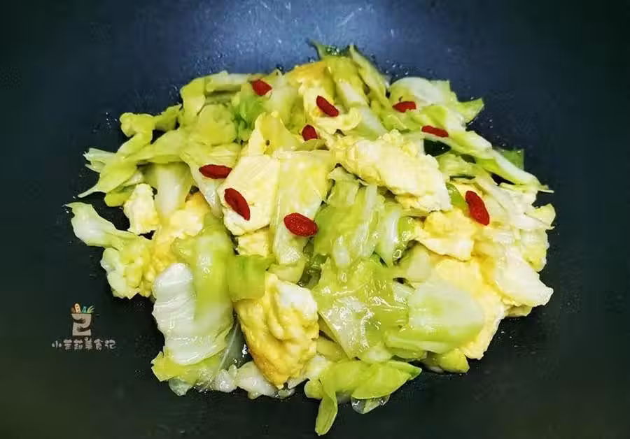 5、在包菜中調入一些鹽炒至入味,再將雞蛋倒進去炒勻,最後撒一把枸杞來增添喜氣,即可關火裝盤。