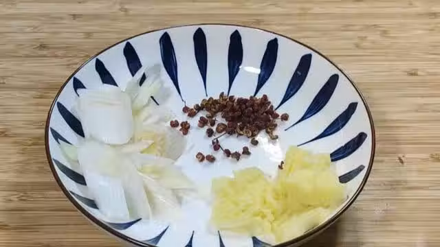2.起鍋,加入一碗清水,然後放入大蔥、生薑、花椒,開小火慢慢煮沸,逼出大料中的香味。大約水開後接著煮5分鐘關火,讓大料水自然冷卻,最後用漏勺過濾出蔥、姜、花椒即可。